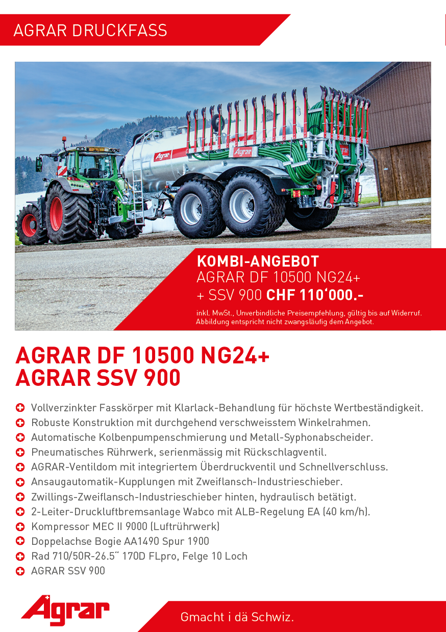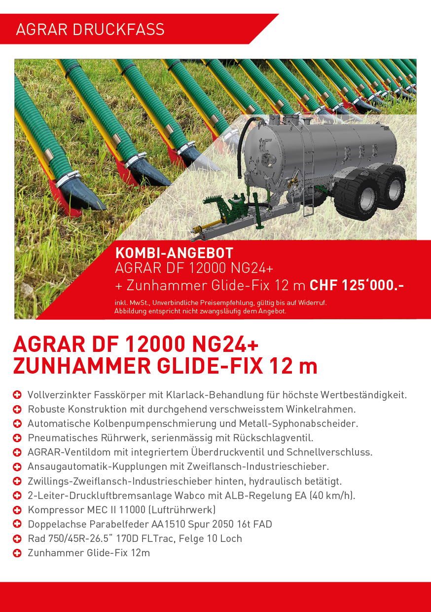 Unsere beiden AGRAR Fässer DF 10500 und DF 12000 der neuen Generation NG24+ mit entsprechendem Schleppschuhgestänge zum attraktiven Kombi-Angebot.
